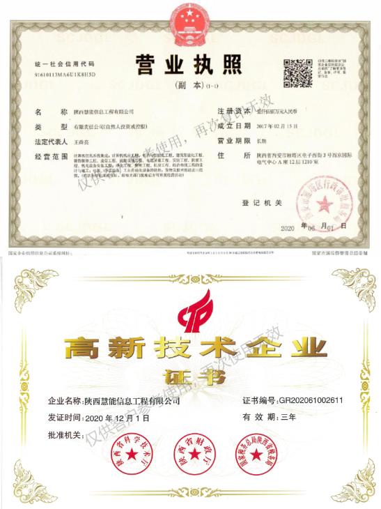 公司自成立至今先后獲得了《電子與智能化工程專(zhuān)業(yè)承包二級(jí)》、《建筑裝飾裝修工程專(zhuān)業(yè)承包二級(jí)》、《建筑機(jī)電安裝工程專(zhuān)業(yè)承包叁級(jí)》、《武器裝備科研生產(chǎn)單位保密三級(jí)》、《陜西省安全技術(shù)防范工程設(shè)計(jì)、施工、維修》、《安全生產(chǎn)許可證》,《陜西省高新技術(shù)企業(yè)》、《慧能移動(dòng)智維系統(tǒng)》等13項(xiàng)軟件著作權(quán),2項(xiàng)國(guó)家發(fā)明專(zhuān)利,并通過(guò)了《ISO90001》質(zhì)量體系、《ISO14001》環(huán)境體系、《ISO45001》職業(yè)健康安全體系、《ISO20000》信息技術(shù)服務(wù)管理體系、《ISO27001》信息安全體系等證書(shū);